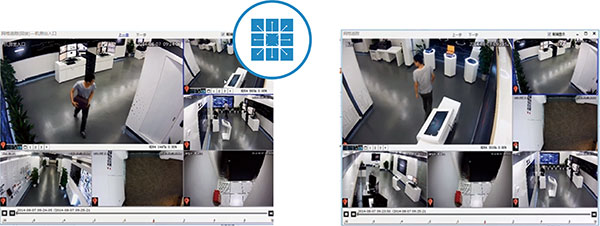 When the object is captured by multiple cameras, multiple windows can be displayed on one screen once video track function is activated. Click one of the cameras in the E-map, the live views of that camera and cameras nearby are displayed, helping to locate the moving object.