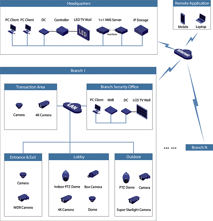 은행은 지점이 많습니다. 본사는 모든 지사들을 전용 네트워크를 통해 감시해야 합니다. UNV 은행 감시 솔루션은 일부 지점에 전용 네트워크가 없어도 상호 연결 문제를 해결할 수 있습니다. Uniview는 잠재적 보안 문제를 해결하고 은행과 관련된 모든 종류의 감시 시나리오에 적용할 수 있는 성숙 단계의 은행 감시 솔루션을 소유한 2005년부터 비디오 감시 산업에 종사해 왔습니다.