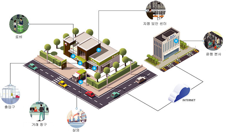 은행은 채무 부담을 통해 조달된 자금을 대출하도록 허가를 받은 금융 기관입니다. 은행에는 ATM 및 금고 등 각종 중요한 시설이 있으며 은행은 매일 수많은 고객들을 상대합니다. 따라서, 완전하고 포괄적인 은행 비디오 감시 솔루션이 고려되어야 합니다. 사각 지대가 없는 모든 주요 구역을 감시하고 본사에서 통합 관리를 구현해야 합니다.